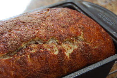 Preheat the oven to 375 degrees. In a small bowl, whisk together the egg & pinch of salt. Brush over the top of the loaf & then dust the top with the remaining cinnamon sugar mixture.