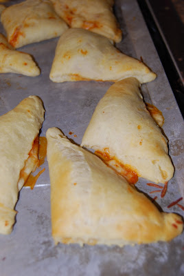 Roll out crescent rolls and split into the 8 triangles. Spoon about a teaspoon of sauce onto roll and top with a few slices of ham, then a sprinkling of cheese. Fold top of crescent over and press down all the edges. Repeat for all crescents. Spray with non fat butter cooking spray, or brush with olive oil.